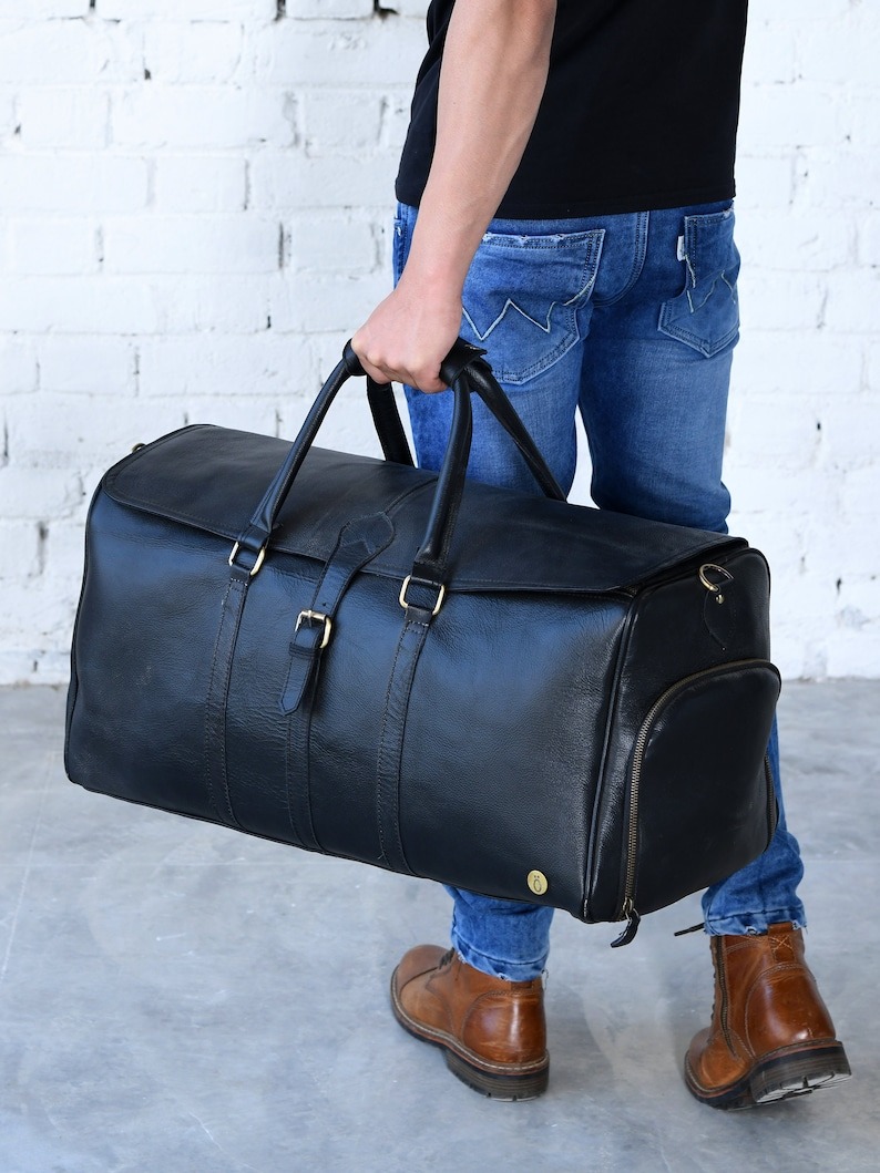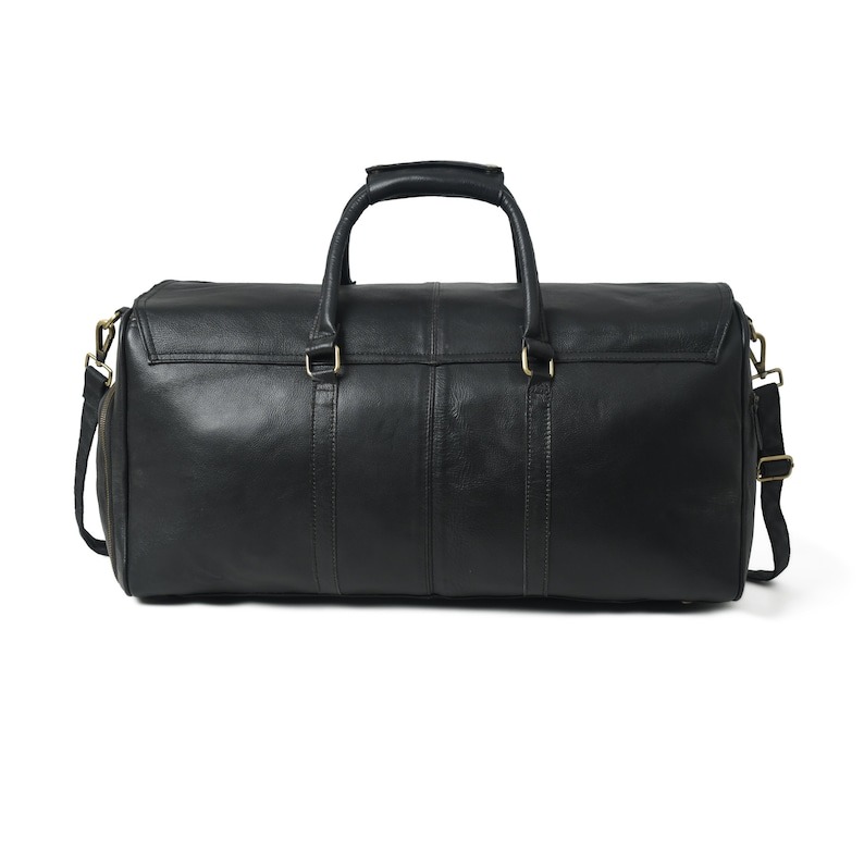Travel in style with this handcrafted black leather duffel bag, made from premium full-grain leather. Designed for the modern traveler, this bag features a sleek design with ample space for your essentials, including a dedicated shoe compartment. Whether for a weekend getaway, holiday, or business trip, this travel bag has everything you need to travel in comfort and style. Explore our collection of leather duffle bags on our website.