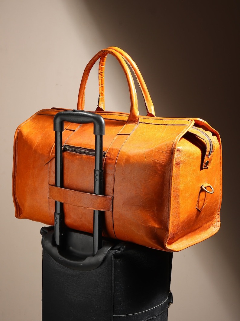 Crafted from premium full-grain leather, this personalized leather duffle bag is the perfect companion for all your travel adventures. Whether it’s a weekend getaway or a longer trip, this leather weekender travel bag offers ample space with a spacious main compartment, two internal and external pockets for extra organization, and a trolley strap for easy attachment to your luggage. The adjustable shoulder strap and reinforced handles ensure comfort while carrying, making it an ideal choice for frequent travelers, professionals, or anyone seeking a stylish and functional travel bag. Perfect for gifting during the holidays or any special occasion, this leather hold all combines durability, practicality, and timeless style.