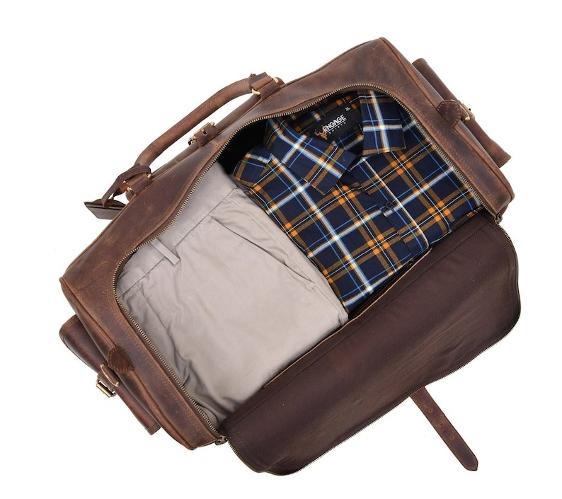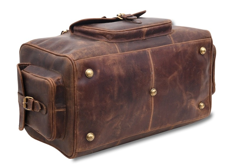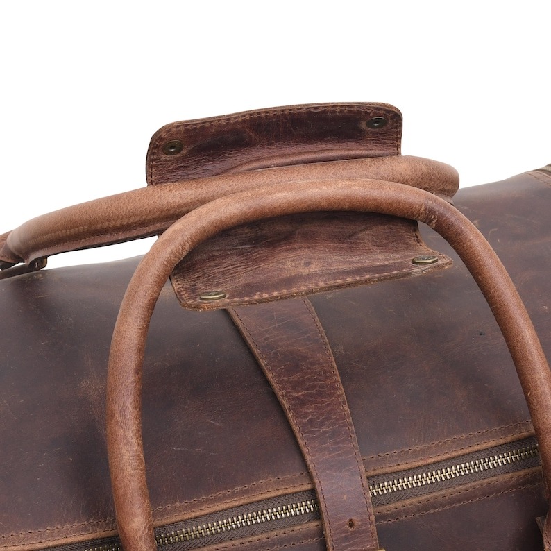 - Handmade full-grain buffalo leather weekender bag.